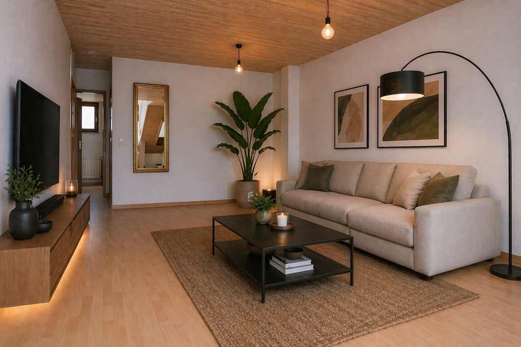 | Austattung:: | Gaszentralheizung. Laminatboden im Wohn- und Schlafzimmer und Flur. Bad mit Badewanne und Waschbecken – weißmelierte Wand- und Bodenfliesen, Sanitärgegenstände in Farbe Manhattan. Separates Gäste-WC mit Waschbecken - weißmelierte Wand- und Bodenfliesen, Sanitärgegenstände in Farbe Manhattan. Einbauküche mit sämtlichen elektr. Großgeräten (außer Kühlschrank). Hausgegensprechanlage. Großer Südbalkon. Des Weiteren gehören zur Wohnung ein Abstellraum im Untergeschoss sowie ein oberirischer Kfz-Stellplatz. Zur gemeinschaftlichen Nutzung gehört die Waschküche im Untergeschoss. |