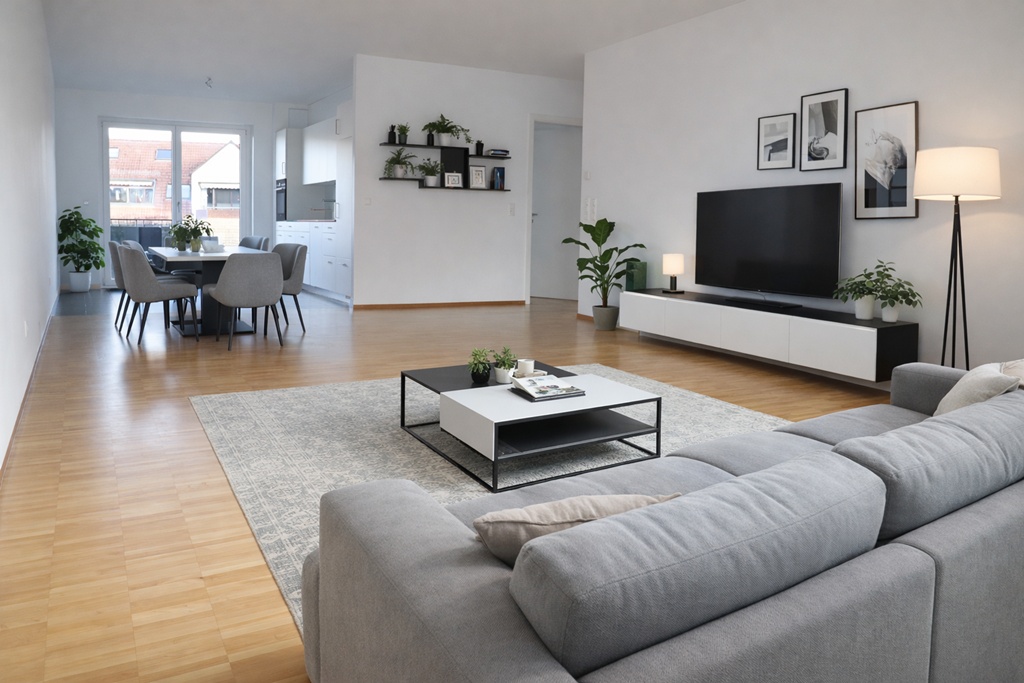 Ausstattung::Fußbodenheizung. Personenaufzug. Parkettboden (Eiche) im gesamten Wohnbereich. Großes Bad mit Badewanne, bodengleicher Dusche mit Glasabtrennung Waschbecken und WC – weiße Sanitärgegenstände und Wandfliesen, Bodenfliesen in anthrazit. Separates Gäste-WC mit Waschbecken - weiße Sanitärgegenstände und Wandfliesen, Bodenfliesen in anthrazit. Weiße Innentüren. Moderne, offene Einbauküche / Küchenblock mit sämtlichen elektr. Großgeräten und weiße Fronten (Mietzuschlag € 120,--/Monat). Elektr. Jalousien. Video-Türsprechanlage. Balkon mit ca. 26 m². Des Weiteren gehören zur Wohnung ein großer Abstellraum im Untergeschoss sowie ein Stellplatz in der Tiefgarage. Zur gemeinschaftlichen Nutzung gehören die Waschküche sowie ein Kinderwagenraum im Untergeschoss.